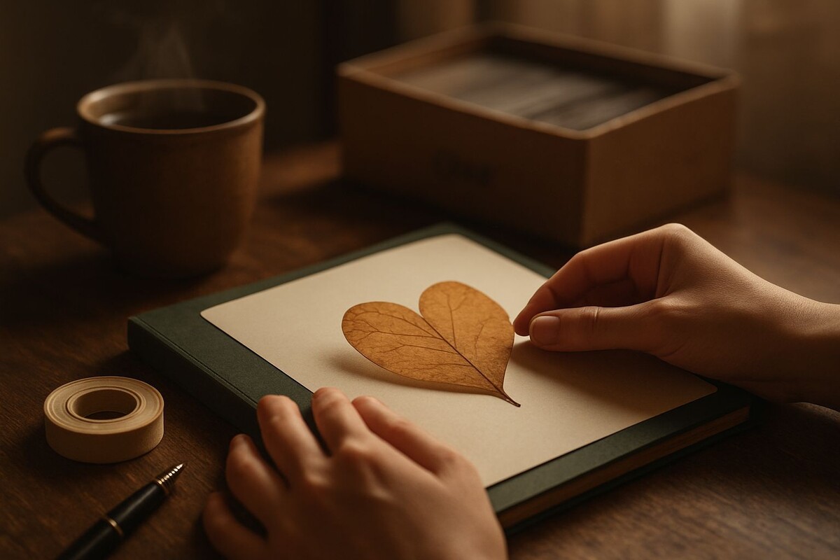 Дома, за кухонным столом, она достала тот самый хрустевший листок из коробки. Положила его на белую страницу нового альбома. Он выглядел одиноко, как точка в пустом предложении. Лера взяла узкий скотч и аккуратно, за уголки, прикрепила лист к бумаге. Потом достала ручку и внизу, мелким почерком, вывела: «Первое тихое открытие. 12 октября. Тишина имеет запах — пыль и сухие листья».