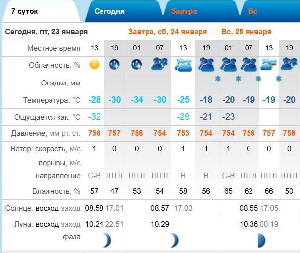 В субботу ночью ещё довольно холодно и -34, днём столбик термометра поднимется до -25, небо будет пасмурным, осадков синоптики в этот день не прогнозируют, ветер восточного направления 1 м/с. В воскресенье ночью всего -20, днём воздух прогреется до -19, облачно, в течение суток небольшой снег и в очередной раз полное безветрие.