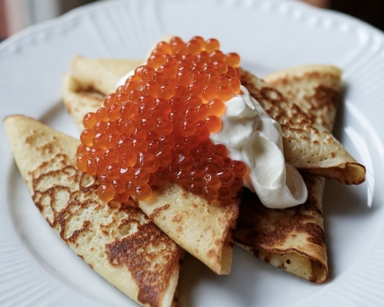 Польза: Икра — источник омега-3 и витамина D (для сердца и иммунитета), блины на кефире — легкоусвояемый белок и кальций.