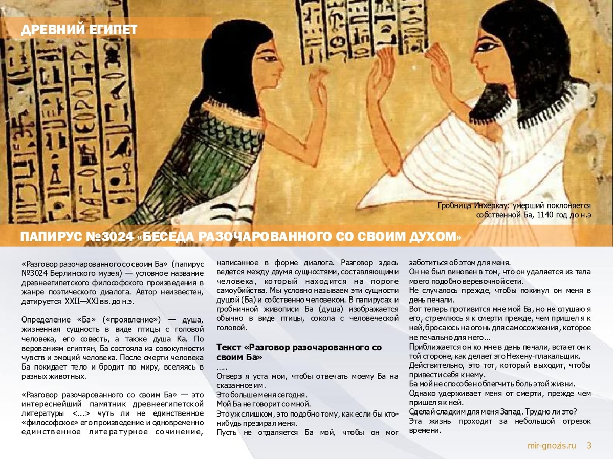«Беседа разочарованного со своим духом» — название текста древнеегипетского папируса (№ 3024 Берлинского музея) в жанре поэтического диалога, созданного в XXII—XXI вв до н. э. ***