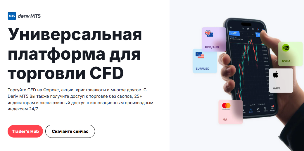 Откройте для себя новые горизонты в мире финансов с платформой Deriv MT5. Мы предлагаем передовые решения для торговли контрактами на разницу цен (CFD) на самые востребованные активы: от традиционных валютных пар Форекс и акций глобальных корпораций до динамичных криптовалют и сырьевых товаров.