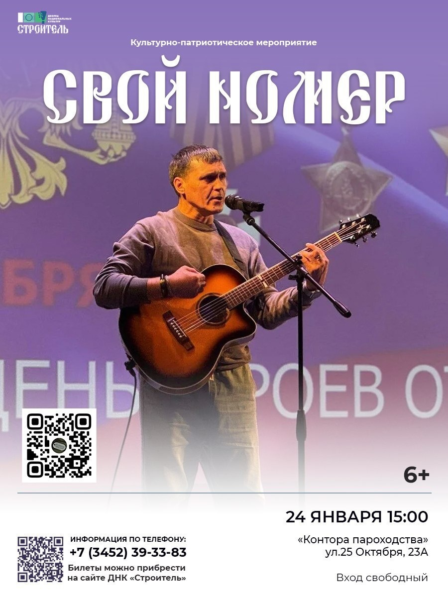 Когда: 24 января 2026 года, 15:00 Где: Контора Пароходства, ул. 25 Октября, 23А 🎶 «СВОй номер» — это культурно-патриотическое мероприятие, посвящённое поддержке семей, участников и ветеранов специальной военной операции. Здесь звучат авторские стихотворения и песни, наполненные историями мужества и верности Родине. 👪 На одной площадке соберутся ветераны СВО и волонтёры, чьё творчество становится живой летописью подвига и взаимной поддержки. ⭐ Мероприятие организовано в рамках регионального проекта «СВОй номер» при поддержке Дворца национальных культур «Строитель». Источник: Дворец Строитель #24_январь_2026@afisha_kto
