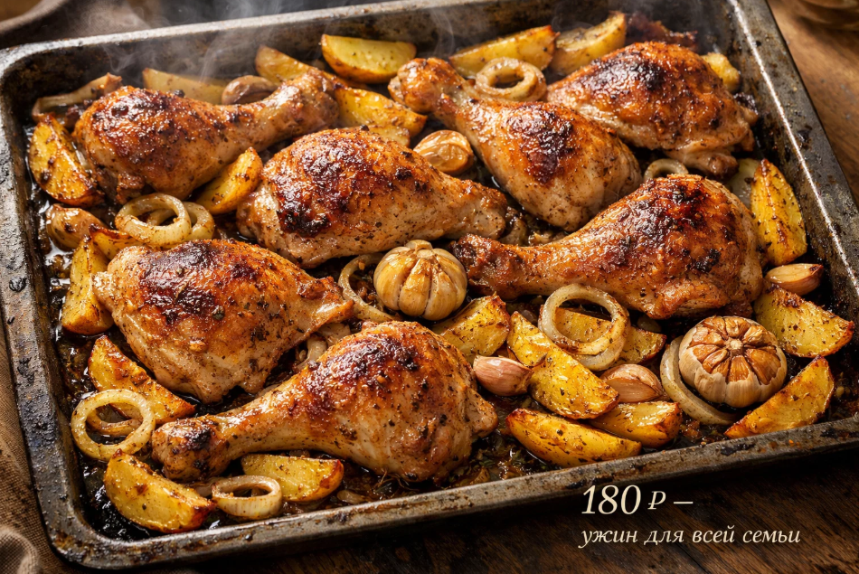 Куриные бёдра или голени — самая бюджетная часть птицы. В обычном сетевом магазине килограмм можно найти рублей за сто двадцать, а если попасть на акцию, то и за девяносто. Картошка осенью вообще стоит копейки, особенно если брать не мытую в красивой упаковке, а обычную, из сетки. Лук, чеснок, растительное масло, специи — это всё есть на любой кухне. Их стоимость в пересчёте на одно блюдо получается смехотворной.