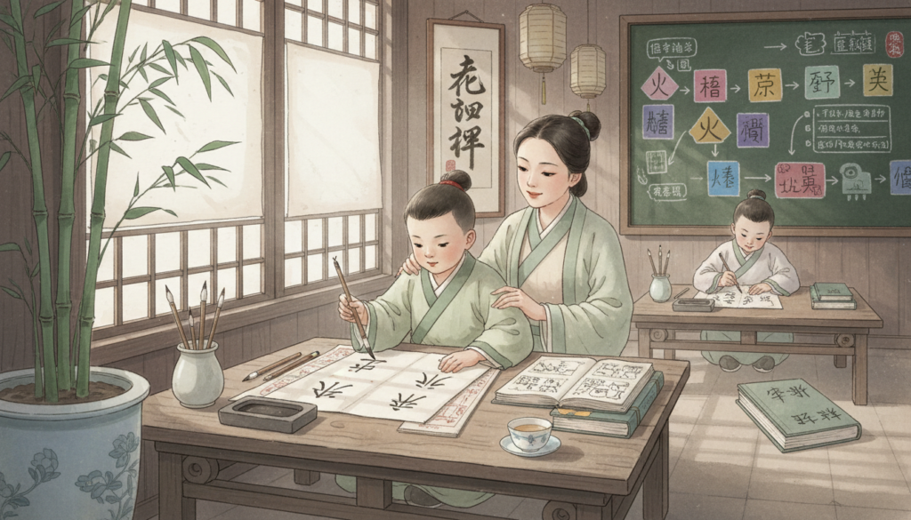 Каждый иероглиф — отдельная мини‑картинка со своим смыслом. Ребёнок видит не набор черточек, а схему объекта или ситуации. Иероглиф «огонь» похож на языки пламени, «дерево» напоминает ствол с ветвями. А когда три «дерева» собираются вместе, получается «лес» — целостный образ, который не нужно дополнительно объяснять.