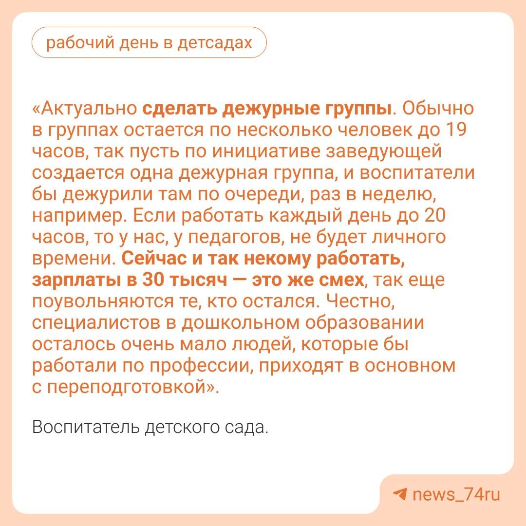 «Зарплаты в 30 тысяч — это же смех» А мы продолжаем тему о предложении Путина увеличить рабочий день в детсадах. На этот раз публикуем мнения челябинских педагогов. Садики в Челябинске работают, как правило, 12 часов — с 07:00 до 19:00. Воспитатели признают, что многие родители забирают детей до шести часов вечера, до семи остаются единицы. Поэтому острой потребности в увеличении рабочего дня работники дошкольных учреждений не видят. Что еще думают педагоги, читайте в карточках ⬆️ А если еще не успели высказать свое мнение, ждем вас в комментариях.