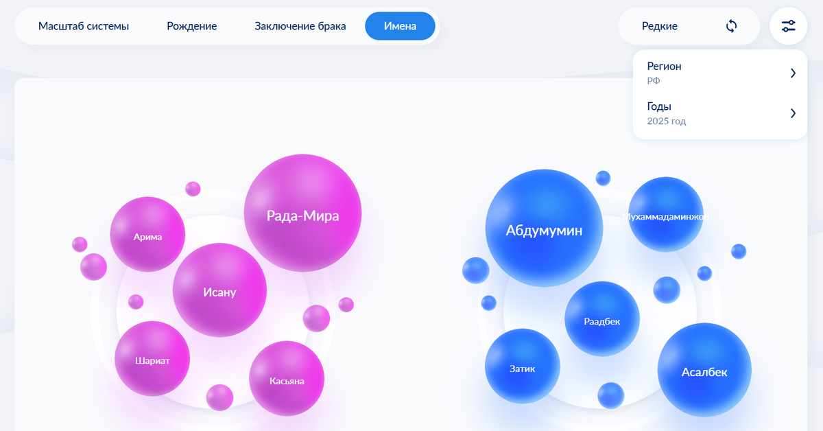 Ну что ж, мы с вами уже подробно изучили всю массовую моду на имена - и по России в целом, и по двум столицам. Первое место у мальчиков и девочек предсказуемо: Софии с Михаилами уже не первый год царят на вершине. Ниже есть сюрпризы. Например, второе место, которое отвоевало себе имя Ева, кажется настоящей сенсацией. Впрочем, не будем пересказывать наши предыдущие статьи на эту тему, вы их и так уже прочитали. А если еще не прочитали, то обязательно сделайте это потом. Ну а сейчас поговорим про имена редкие. Тем более, что вы сами предложили о них рассказать. Итак, заходим все на тот же федеральный портал ЗАГС и выбираем редкие имена 2025 года. То есть те, которые фиксировались наименьшее количество раз. Сколько именно - не указано, но логично сделать вывод, что в единичном варианте. Только не очень понятно, что в данном случае означает крупный кружок, а что более мелкий. Крупный - это 1 имя, более мелкий - 2 имени и т.д.? Или наоборот? Нет, все это сомнительно. Вряд ли было такое, что