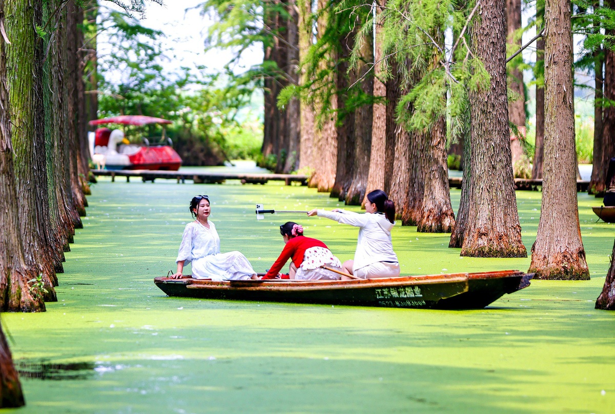 Водно-болотный парк Луян расположен неподалеку от города Янчжоу и годами привлекает туристов уникальными пейзажами. Из-за обилия водорослей его поверхность часто окрашивается в зеленый, а вокруг ровными рядами высажены тысячи метасеквой — особенно там красиво осенью, когда они желтеют, контрастируя с окружением. Зайти туда погулять стоит ¥10 (100 ₽), взять лодку напрокат — ¥50 (500 ₽). #материковыйКитай