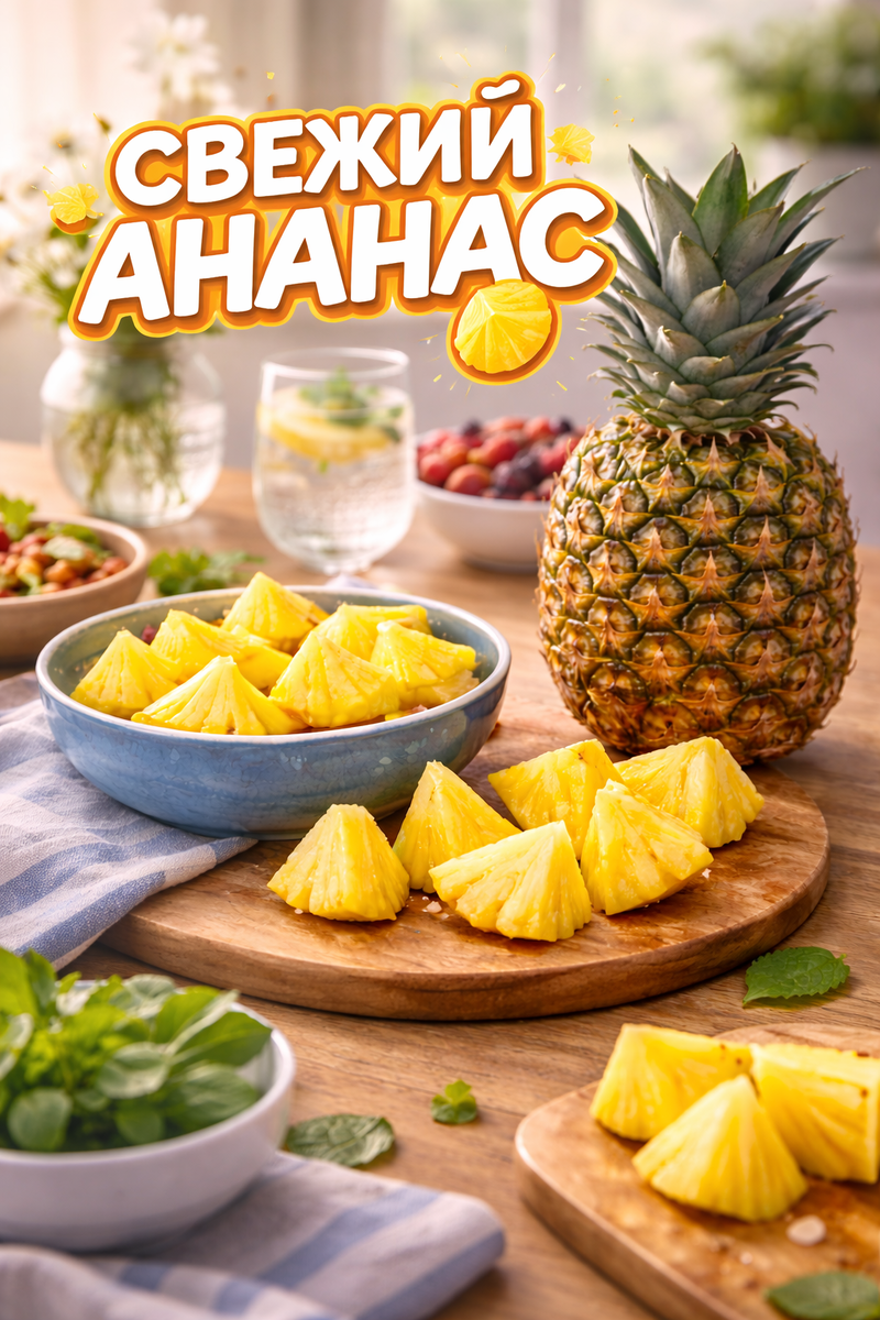 Ананас не требует подготовки или настроения. Его не нужно откладывать «на потом» или ждать выходных. Он легко становится частью обычного дня — купил, нарезал, съел.