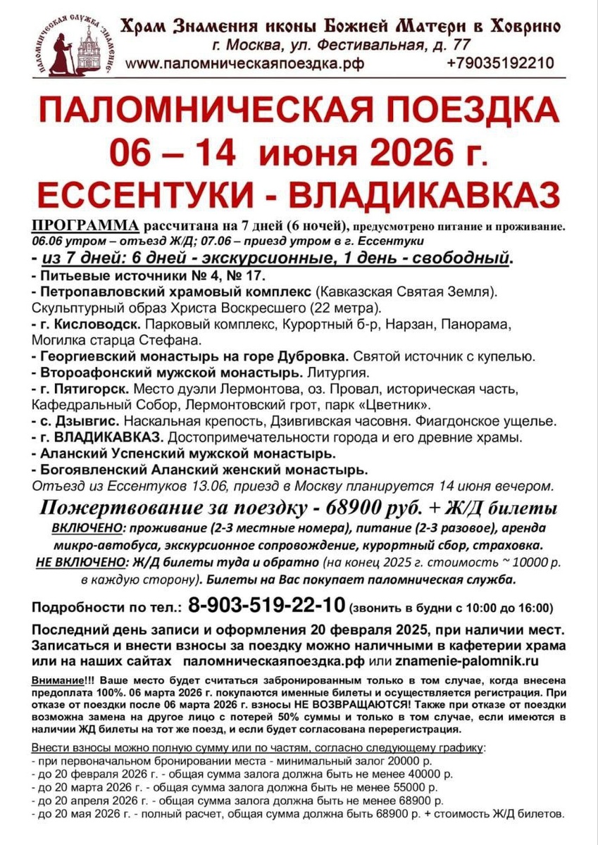 состоится паломническая поездка в Ессентуки - Владикавказ. В программе из 7 дней - 6 экскурсионные. В стоимость все включено, кроме ЖД билетов! Для ознакомления подробной программы и условий бронирования перейдите по ссылке: https://паломническаяпоездка.рф/index.php/sobytiya/79-novosti/692- ✔️ МЕСТ НЕТ!!! Записываем только в резерв!!! Оформление в по тел. +79035192210 или в кафетерии нашего храма.