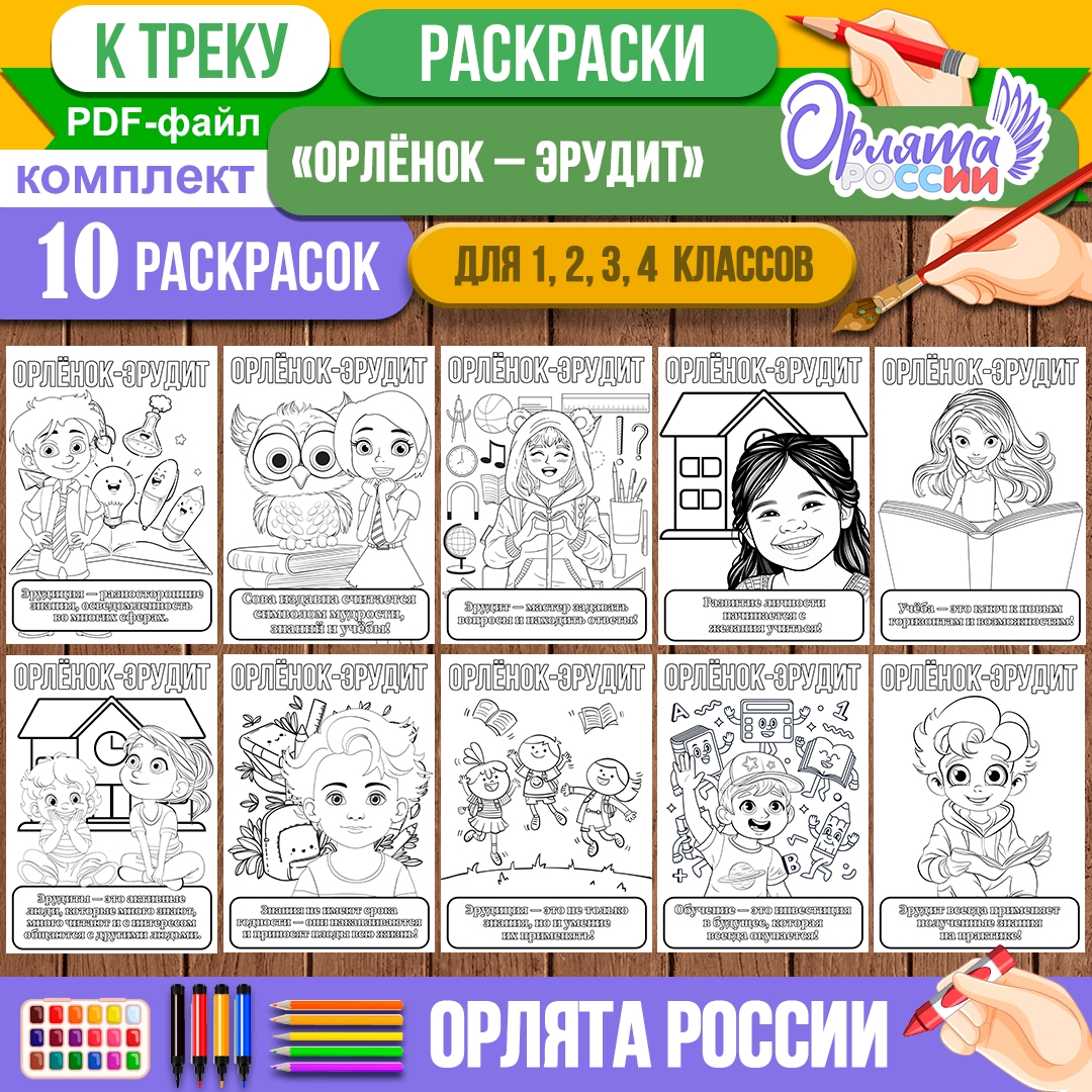 Раскраски «Орлята России»: трек «Орлёнок-Эрудит» (в наборе 10 раскрасок) для 1, 2, 3, 4 класса или детского сада