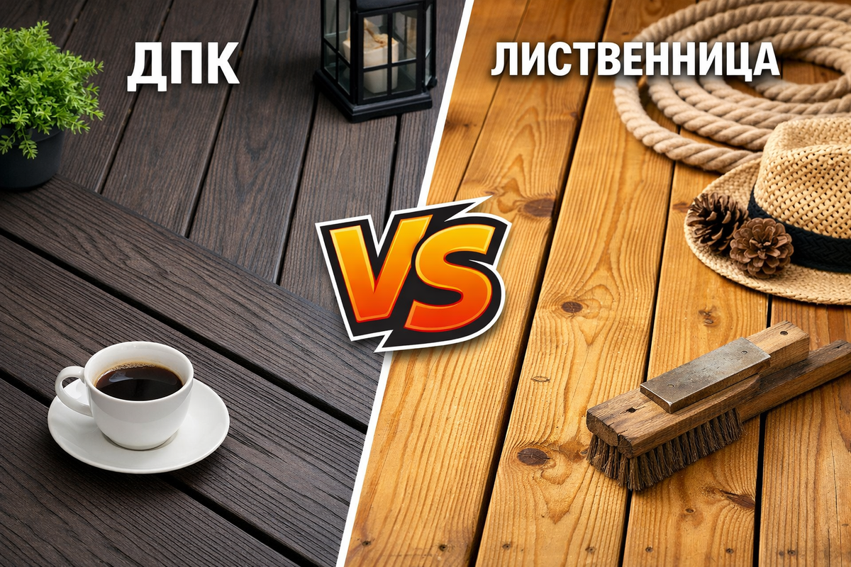 ДПК или лиственница: честное сравнение без маркетинга Когда дело доходит до террасы, большинство выбирает между двумя вариантами: ДПК и лиственницей. Оба материала выглядят достойно, оба подходят для улицы. Но служат они по-разному, и стоят — тоже. Разберёмся спокойно и честно, без рекламных лозунгов. Лиственница: натурально, красиво, но требовательно Лиственница — это натуральное дерево с плотной структурой и высоким содержанием смол. За счёт этого она лучше других пород переносит влагу и перепады температур. Плюсы лиственницы: натуральный внешний вид и текстура дерева; приятные тактильные ощущения; престижный «живой» материал. Минусы, о которых часто молчат: требует регулярной обработки маслом или пропитками; со временем темнеет, может трескаться и коробиться; без ухода теряет внешний вид уже через 2–3 сезона; чувствительна к ошибкам монтажа. Лиственница — хороший вариант, если вы готовы ухаживать затеррасой и воспринимать её как «живой» материал, а не как раз и навсегда сделанное покрытие .ДПК: стабильность и минимум забот ДПК (древесно-полимерный композит) — это смесь древесной муки и полимеров. Он выглядит как дерево, но по поведению ближе к современным строительным материалам. Плюсы ДПК: не боится влаги, солнца и перепадов температур; не гниёт, не трескается, не требует покраски; стабильная геометрия на протяжении всего срока службы; простой уход — достаточно воды. Минусы: качественный ДПК стоит дороже дешёвой лиственницы; у бюджетных брендов возможна потеря цвета и прочности. Важно понимать: хороший ДПК — это не «пластик», а технологичный материал, рассчитанный на долгую эксплуатацию. Итак сравним в лоб!!! Дпк срок службы 20-25 лет Лиственница- 10-15 лет с уходом!! Реакция на влагу Лиственница зависит от ухода Дпк влаги не боится Что выбрать в итоге!!! Если вам важна натуральность и вы готовы ухаживать за террасой — выбирайте лиственницу.