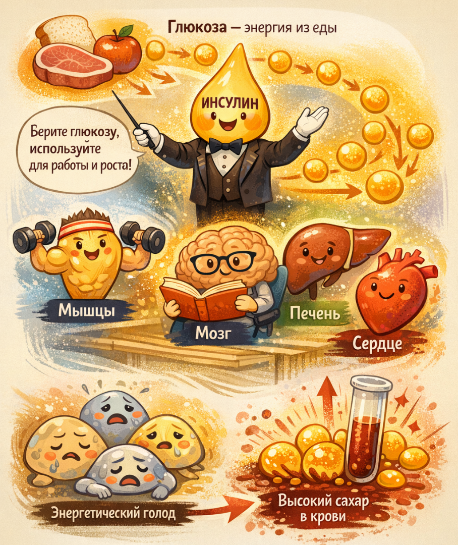 Инсулин — это не просто слово из рецепта или укол в холодильнике. Это ключевой гормон, который отвечает за то, чтобы энергия из пищи переходила в ваши клетки — мышцы, мозг, печень и даже сердце. Он словно дирижёр, который говорит клеткам: «Пожалуйста, возьмите эту глюкозу и используйте её на работу, отдых или рост». Без инсулина клетки оказываются энергетически голодными, а уровень сахара в крови стремительно растёт — так развивается диабет.