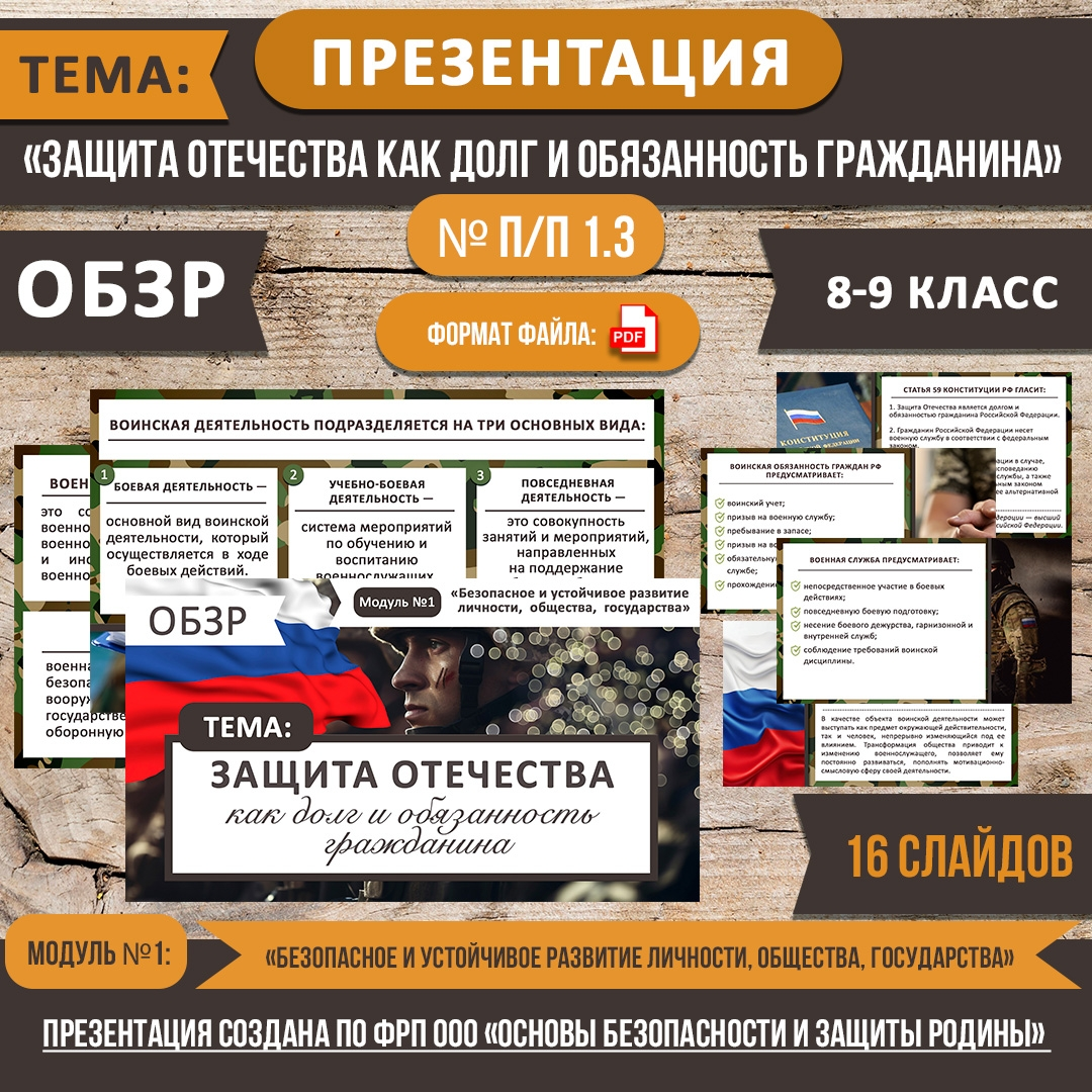 Презентация по теме «Защита Отечества как долг и обязанность гражданина» состоит из 16 слайдов. Создана по теме № п/п 1.3 модуля №1 «Безопасное и устойчивое развитие личности, общества, государства» ФРП ООО «Основы безопасности и защиты Родины» для 8–9 классов. 📌 Презентация красиво и аккуратно оформлена, представлена в PDF-формате. 📥 Содержание презентации «Защита Отечества как долг и обязанность гражданина» по слайдам: Слайд 1. Тема: «Защита Отечества как долг и обязанность гражданина». Слайд 2. Статья 59 Конституции РФ гласит ... Слайд 3. Военная организация государства. Военная безопасность. Слайд 4. Военная служба. Воинская обязанность. Слайд 5. Воинская обязанность граждан РФ предусматривает … Слайд 6. Военная служба предусматривает … Слайд 7. Воинская деятельность подразделяется на три основных вида … Слайд 8. Воинская деятельность включает в себя … Слайд 9. Обязательная подготовка гражданина к военной службе. Слайд 10. Добровольная подготовка гражданина к военной службе. Сл