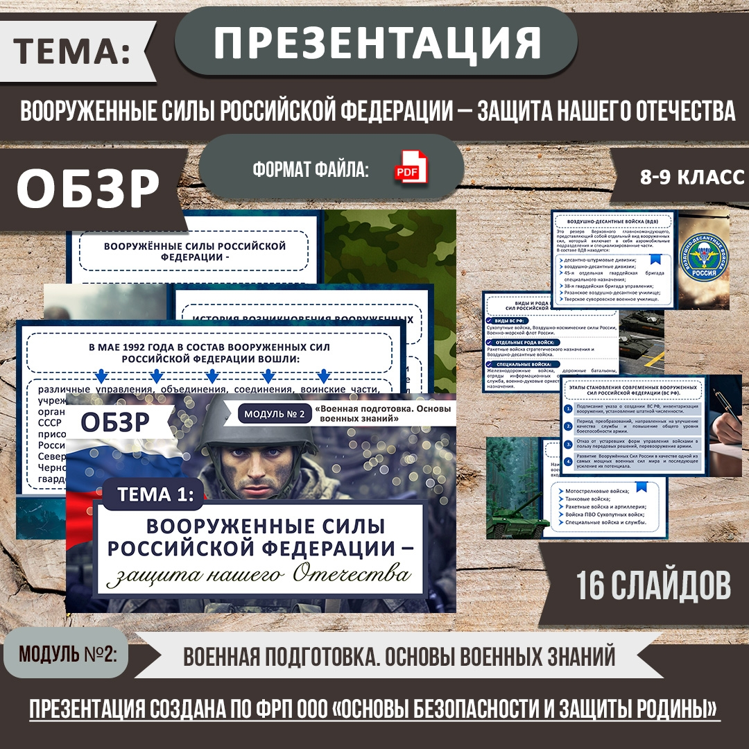 Презентация по теме «Вооруженные Силы Российской Федерации – защита нашего Отечества» состоит из 16 слайдов. Создана по теме № п/п 2.1 модуля №1 «Военная подготовка. Основы военных знаний» ФРП ООО «Основы безопасности и защиты Родины» для 8–9 классов. ✅Презентация красиво и аккуратно оформлена, насыщена актуальной информацией, представлена в PDF-формате. 👉Содержание презентации «Вооруженные Силы Российской Федерации – защита нашего Отечества» по слайдам: Слайд 1. Тема: Вооруженные Силы Российской Федерации – защита нашего Отечества. Слайд 2. Вооружённые силы Российской Федерации – это … Слайд 3. История возникновения Вооруженных Сил Российской Федерации. Слайд 4. В мае 1992 года в состав Вооруженных сил Российской Федерации вошли … Слайд 5. Этапы становления современных Вооруженных Сил Российской Федерации (ВС РФ). Слайд 6. Виды и рода Вооруженных Сил Российской Федерации (ВС РФ) Слайд 7. Сухопутные войска. Слайд 8. Воздушно-космические силы. Слайд 9. Военно-морской флот. Слайд 10. Р