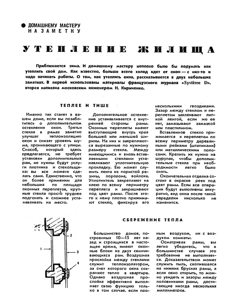 Зима в разгаре, а тут как раз попалась статья о том, как утеплить квартиру И статья из журнала Наука и жизнь аж 1978 года. Для интересующихся статья прикреплена к посту. Для ленивых пару цитат: "Теплее и тише. Именно так станет в вашем доме, если вы позаботитесь о дополнительном остеклении окон. Третьи стекла в рамах заметно улучшат теплоизоляцию окон и снизят уровень шума, проникающего с улицы. Способ, который здесь предлагается, не требует установки дополнительных рам, не нужны будут услуги плотника и стекольщика: вы все можете сделать сами. Единственно, что он более применим для небольших по площади оконных переплетов, крупные стекла просто труднее подгонять и сложнее устанавливать на место." "Так мы устраним основную потерю тепла через окна. Но холод проникает в квартиру и другим путем: через щели между рамами и оконными коробками. Для борьбы с этим применяют общеизвестный прием — заклеивают щели бумажными полосами. Можно заклеивать их и прозрачной липкой лентой (типа КЛТ, продаетс