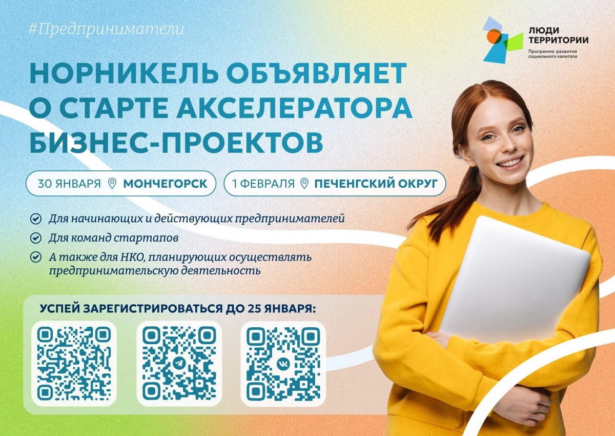 ? Участвуй в Акселераторе бизнес-проектов программы развития социального капитала Норникеля «Люди территории». За два месяца участники узнают, как быстро и эффективно запустить собственный бизнес. Действующим предпринимателям опытные менторы помогут вывести бизнес-процессы на новый уровень. 🌟 А по результатам обучения лучшие проекты получат финансовую поддержку от Норникеля. Успей зарегистрироваться 🔗 forms.yandex.ru/u/691da2ab95add52cb610cbe0 Вступай в телеграм-канал 🔗 t.me/biznespeopleinarctic