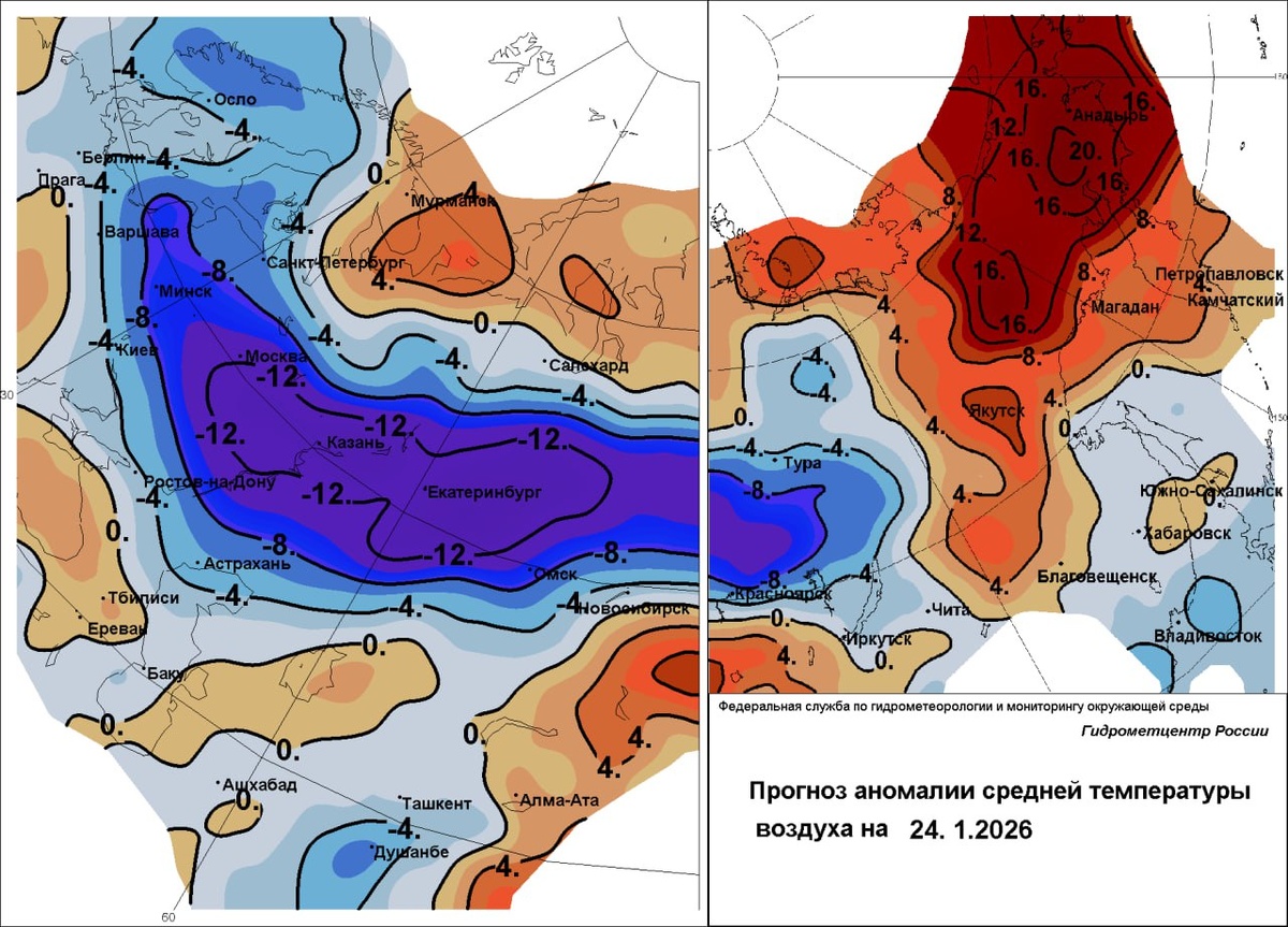 Синоптики говорят, что в субботу, воскресенье и понедельник Челябинская область все еще останется под сибирским антициклоном. Поэтому аномальный холод сохранится, но снегопадов не будет. В ночь на субботу в низинах региона будет до -40⁰, днем ожидается около -24 … -30⁰, в Челябинске ночью — до -32⁰, днем около -22⁰. В воскресенье и понедельник по ночам будет примерно также — около -30⁰, а вот днем немного теплее: в Челябинске прогнозируют -18⁰ … -21⁰. Судя по карте аномалий, в нашем регионе температура в выходные будет на 12 градусов ниже средней. Утепляемся и готовимся отдыхать на диване под одеялом