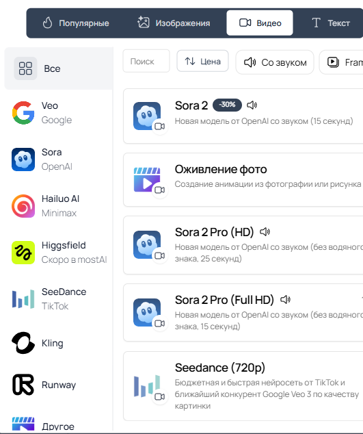 Пополняете баланс на 1000 ₽ — получаете 500 бонусов дополнительно. Если вам нужен Sora 2 без VPN в России, это один из самых простых вариантов.