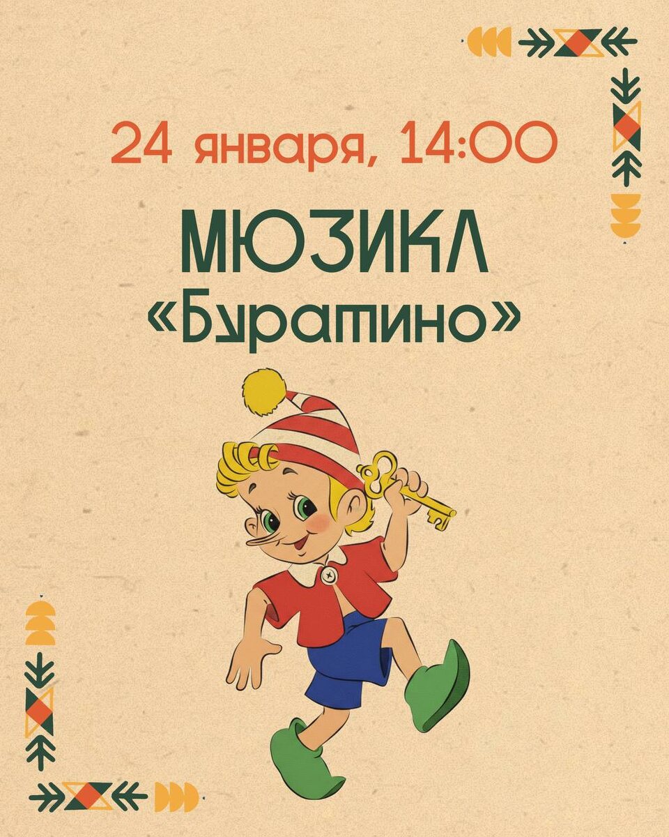 » 📍ТРЦ Город Лефортово, шоссе Энтузиастов, 12к2 🗓️ 24 января с 14:00 до 15:00 Гостей ждет настоящее цирковое шоу по любимой сказке, с песнями, героями и их приключениями! На сцене появятся Буратино и Мальвина, Пьеро и Артемон, кот Базилио и лиса Алиса, Черепаха Тортилла и Карабас Барабас! Подробнее ЗДЕСЬ @Together_with_kids Пост носит информационный характер Поддержать канал голосом ЗДЕСЬ 📲 Подписаться в МАХ