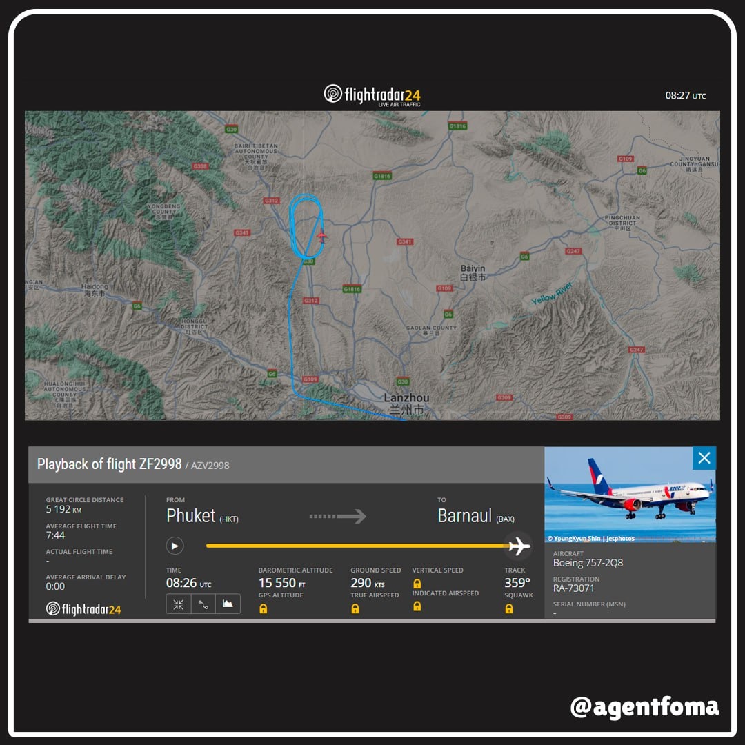 Сегодня утром самолет Boeing 757 авиакомпании Azur Air, направлявшийся из Пхукета в Барнаул, подал сигнал бедствия и готовится совершить незапланированную посадку в аэропорту китайского города Ланьчжоу. Экипаж судна передал международный код тревоги 7700, означающий возникновение серьезной опасности на борту. На борту самолёта находится 238 пассажиров. Судно было в полете примерно четыре часа, преодолев около 2456 километров из запланированных шести тысяч, когда возникла необходимость экстренного снижения. Официальные представители Azur Air заявили, что специалисты авиакомпании отслеживают развитие ситуации и держат связь с наземными службами Китая. Службы авиационной безопасности проводят срочные мероприятия по подготовке к приёму воздушного судна в международном аэропорту Ланьчжоу. Полёты других самолётов временно приостановлены для обеспечения безопасной посадки борта с пассажирами. 🔘Отказ одного из двигателей, по данным SHOT, - причина сигнала бедствия борта Пхукет - Барнаул.