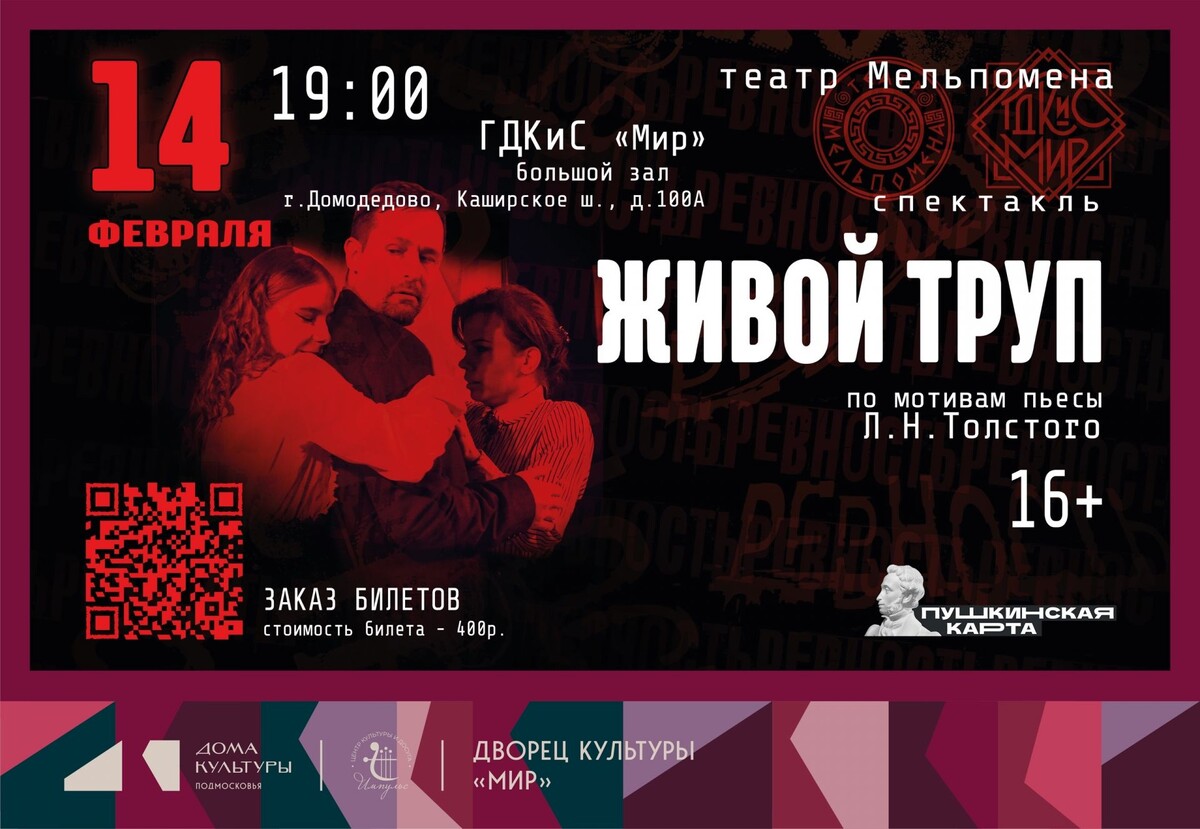 ✨ «Живой труп» в новой интерпретации — это не просто история о человеке, разочаровавшемся в жизни. Спектакль предлагает современную оптику для прочтения классической пьесы Л. Н. Толстого. В центре внимания — не столько фабула, сколько внутренняя логика поступков Фёдора Протасова: что на самом деле движет его решением уйти из семьи? Где граница между свободой личности и бегством от ответственности? И возможно ли сохранить брак, не вкладывая в него усилий? 📆 14.02.2026🕒19:00 🏢 Дворец культуры и спорта «Мир» 📍 г. Домодедово, Каширское шоссе, д.100А 💰 Цена: 400 ₽ ✅ Мероприятия Домодедово https://dzen.ru/id/66f10385cc4c5a16f7b5fb02 http://vk.com/domodedovo_events http://dzen.ru/domodedovo_events