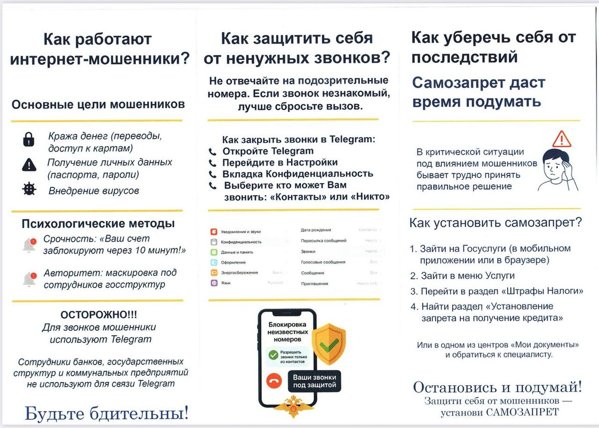 МВД РОССИИ ПРЕДУПРЕЖДАЕТ ЗАЩИТИ СЕБЯ ОТ МОШЕННИКОВ Как защитить себя? ❗️Не переводите деньги незнакомцам, даже под давлением. ❗️ Не называйте личные данные (Ф.И.О., адрес, дату рождения) по телефону. ❗️Никому не сообщайте коды (РIN, SМS, CVC) – их не спрашивают банки! ❗️ Не скачивайте приложения из сомнительных ссылок. ❗️Проверяйте сайты перед онлайн-покупками. ❗️ Перезванивайте родственникам, если звонят «за помощью». МОШЕННИКИ НЕ ДРЕМЛЮТ ! ————— Поддержите канал Подпиской на "Сыны Отечества" или Голосом за канал ✅ подписаться |⚡️проголосовать 📲Наш проект в социальных сетях: Вконтакте, Одноклассники, Дзен, RuTube Теперь мы и в МАХ!