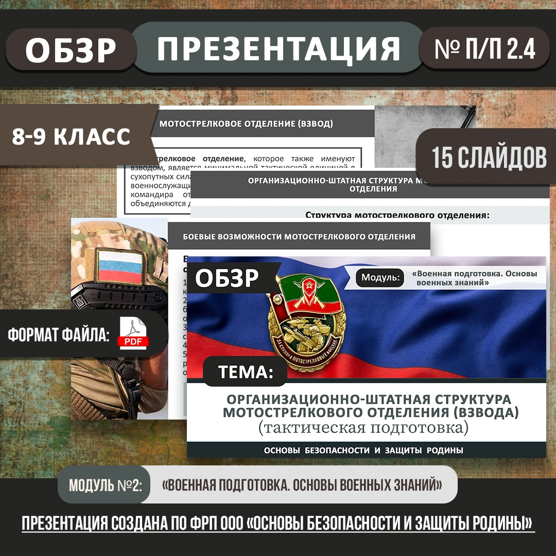 Презентация по теме «Организационно-штатная структура мотострелкового отделения (взвода) (тактическая подготовка)» создана для урока ОБЗР в 8-9 классе. Она включает в себя 15 слайдов. 👉Содержание презентации по слайдам: Слайд 1. Тема «Организационно-штатная структура мотострелкового отделения (взвода) (тактическая подготовка)». Слайд 2. История создания мотострелковых войск. Слайд 3. Мотострелковое отделение (взвод). Слайд 4. Организационно-штатная структура мотострелкового отделения. Слайд 5. Боевые возможности мотострелкового отделения. Слайд 6. Тактические действия мотострелкового взвода. Слайд 7. Задачи мотострелкового взвода в обороне. Слайд 8. Состав средств индивидуальной бронезащиты и экипировки военнослужащего МСО. Слайд 9. Современные виды средств экипировки военнослужащего МСО. Слайд 10. Характеристики современных средств экипировки военнослужащего. Слайд 11. Характеристики современных средств индивидуальной бронезащиты. Слайд 12. Назначение современных средств индивидуал