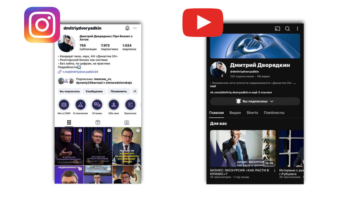 В октябре 2025 мы перезапустили блоги Дмитрия Дворядкина – владельца крупнейшей сети агентств недвижимости на Алтае. Instagram* не вёлся два года, TikTok вообще не существовал, YouTube – практически ноль, ВК полудохлый для галочки.