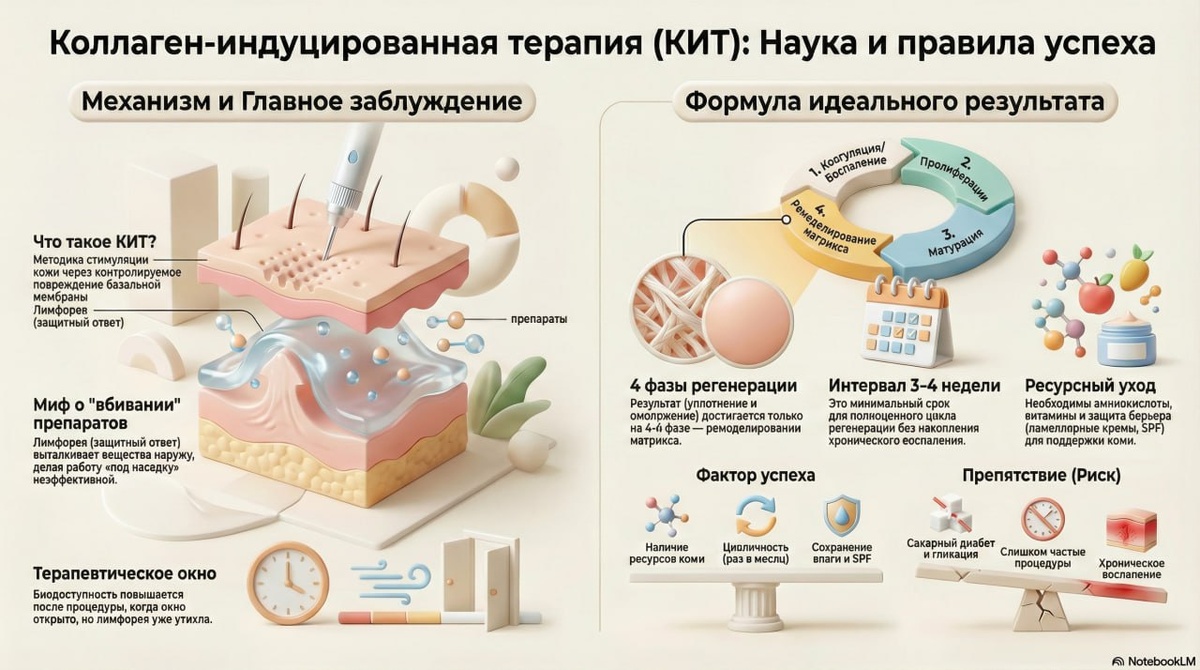 Коллаген-индуцированная терапия открывает терапевтическое окно за счёт повреждения эпидермальных структур, включая роговой слой. Роговой слой — это непреодолимый барьер кожи, и его разрушение повышает биодоступность нанесённых веществ.