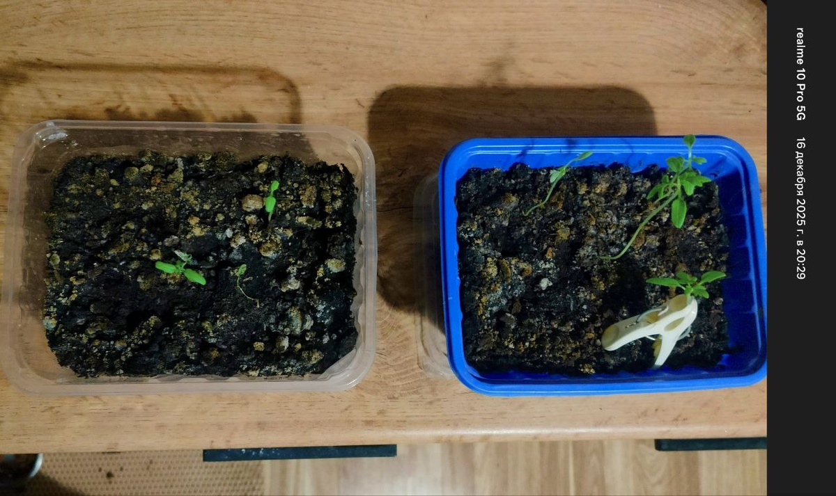 16 декабря появилось подозрение, что дело обретает бесперспективный оборот) Из 5 семечек "Черри блосэм" выжили три росточка, выглядят довольно бодро, хоть и тоненько. Из 4х семечек "Балконного чуда" - только два, и какие-то чахлики. Пересадили их в стаканчики, с дырочками на дне. Поставили снова под лампу. И вот, конец года - помидоры сдохли. На фото - утром уже стало понятно, что шансов нет, не стали поливать. Есть подозрение, что к их смерти причастен кот - на ростках заметны шерстинки. Но это не точно.