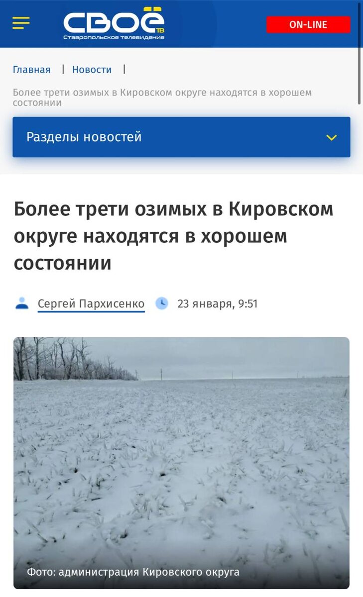Обильные осадки обеспечили посевы влагой. Более трети озимых на полях Кировского округа находятся в хорошем состоянии, остальные – в удовлетворительном. Это способствовали тёплая осень и обильные осадки зимой, напитавшие почву влагой на глубину до 40 сантиметров. Об этом 23 января сообщает управление пресс-службы и информационной политики губернатора и правительства Ставропольского края. «Озимые культуры вошли в зиму в фазах второго и третьего листа, а также находятся в стадии кущения и формирования узловых корней. Это создает благоприятные условия для дальнейшего роста и заложения основ будущего урожая», — отметил глава Кировского округа Николай Новопашин. Ранее губернатор Ставрополья Владимир Владимиров сообщил о потенциале роста урожая зерновых в регионе.