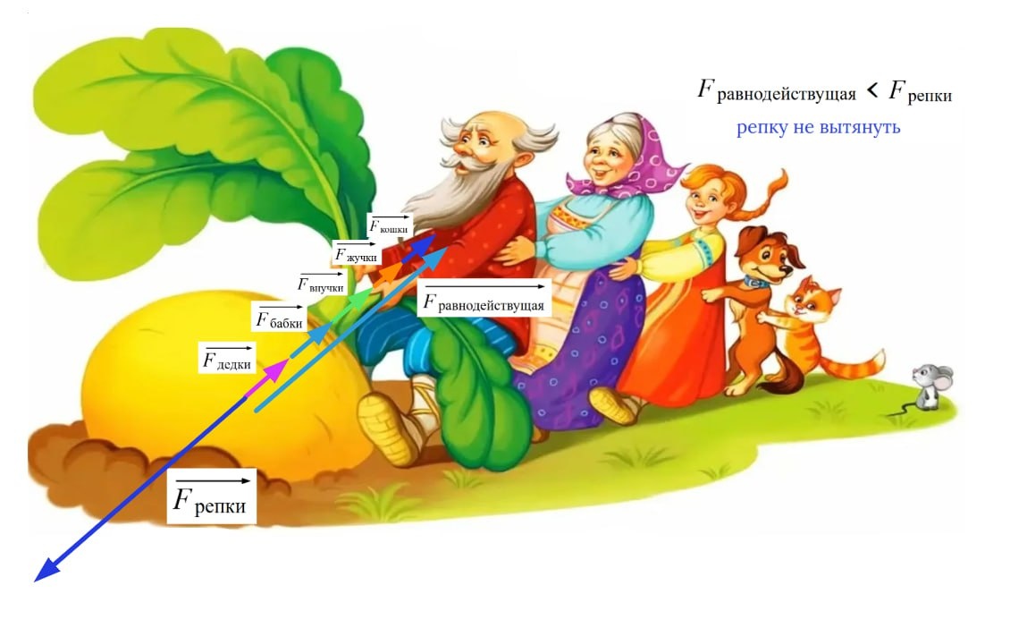 ! Говоря физическими терминами, на равнодействующую сил. Странно звучит, Вам не кажется? 🤔 Кстати, никому не нравится этот термин, он совершенно непонятный для школьников 7 класса, а именно тогда эта тема поднимается впервые. Но идея в следующем: если "белка тянет за репку, а бабка за дедку", то силы дедки и бабки складываются и их общая сила называется "равнодействующая сил" , то есть одна сила, равная по величине сумме тех сил, которые мы сложили. А сложить мы можем сколько угодно сил. В данном случае сил шесть, именно их мы и складываем. И тут даже не важно, что нет чисел. Важны физические правила, которые ненавязчиво доносит сказка: 1️⃣. Силы, приложенные к одному объекту и действующие в одном направлении, складываются. 2️⃣. Если две силы, приложенные к объекту, действуют в противоположных направлениях, то тело движется в сторону большей силы. Вот такой серьёзной оказалась детская сказка! Если у Вас возникли вопросы, пишите в комментариях!