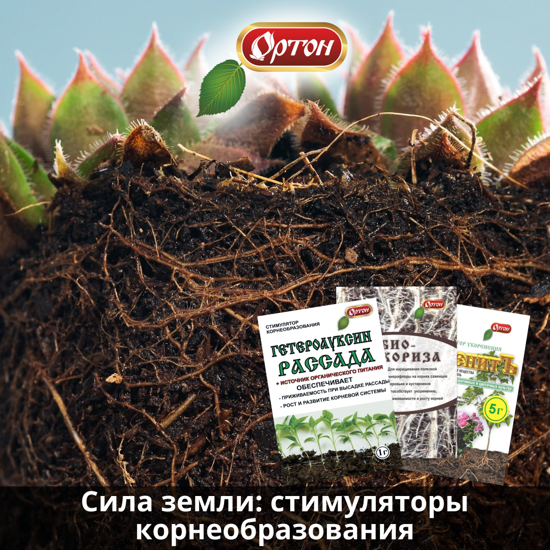 От развитости корней зависят устойчивость растения к стрессам и болезням, а также количество и качество урожая. Быстро нарастить мощную корневую систему и прижиться на новом месте растениям помогают современные биостимуляторы. Рассказываем, как работают эти препараты на примере продукции «Ортон». Для черенкования кустарников и деревьев — «Гетероауксин» Стимулятор на основе натурального растительного гормона ауксина. Незаменим для укоренения самых сложных черенков, например хвойных или плодовых деревьев, а также для улучшения приживаемости саженцев и срастания тканей при прививке. Калиевая соль индолилуксусной кислоты в составе препарата имитирует естественные ростовые процессы растения, стимулируя деление клеток и приводя к быстрому образованию новых корневых отростков, а также пробуждению спящих корневых почек. Для высадки рассады — «Гетероауксин — Рассада» Помогает сеянцам пережить стресс от пересадки, быстро освоиться на новом месте и тронуться в активный рост. Содержит то же активн