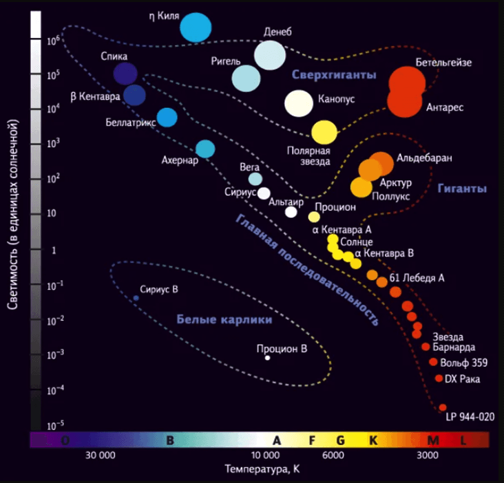 В сердце нашего Солнца каждую секунду 600 миллионов тонн водорода превращается в гелий. Этот процесс, длящийся уже 4,6 миллиардов лет и продлится еще примерно столько же, не уникален. 95% всех звезд во Вселенной в данный момент совершают то же самое. Этот самый долгий и стабильный этап в жизни звезды называется главной последовательностью. Понятие главной последовательности невозможно объяснить без знаменитой диаграммы, созданной в начале XX века. По сути, это «перепись» звездного населения, где по вертикали отложена светимость (мощность излучения звезды), а по горизонтали — температура ее поверхности (или цвет: от голубого к красному). Потрясающий факт: когда астрономы нанесли на такую диаграмму десятки тысяч известных звезд, оказалось, что большинство из них выстроились вдоль узкой изогнутой полосы, идущей из левого верхнего угла (горячие голубые гиганты) в правый нижний (холодные красные карлики). Эта полоса и есть Главная последовательность. Эта диаграмма показывает, что основные х