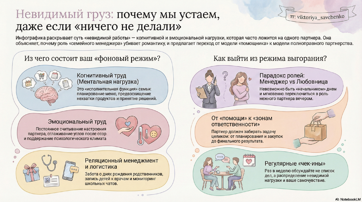 Это часто и есть симптом невидимой работы – когнитивной и эмоциональной нагрузки, которая ложится в основном на одного партнёра. Её нельзя потрогать, её результаты – это отсутствие проблем (вовремя купленные продукты, запланированный отпуск, улаженный конфликт). А её плата – ментальное истощение и медленное разрушение связи между двумя людьми.