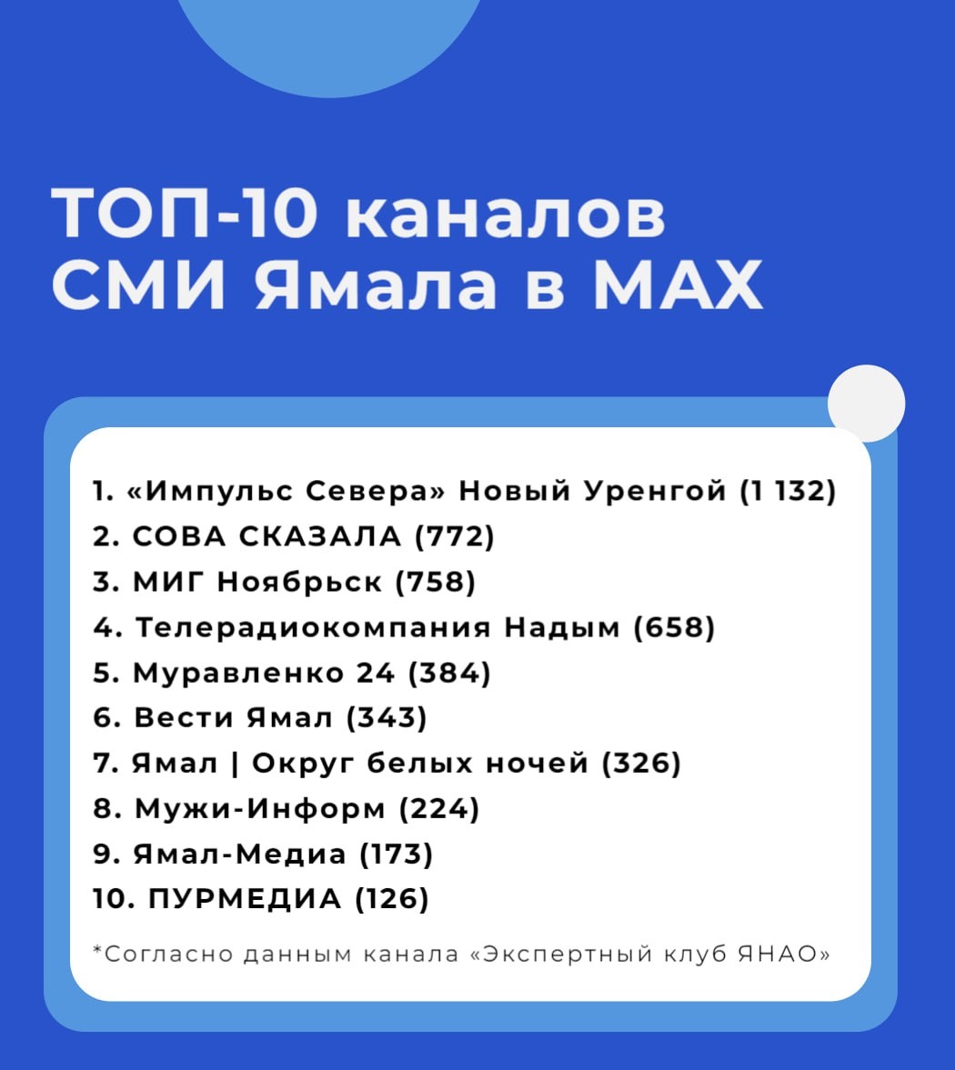 Экспертный клуб ЯНАО представил первый ТОП-10 медиаканалов Ямала в MAX. Наше информагентство заняло 1️⃣ место по количеству подписчиков в списке, где представлены как региональные, так и муниципальные СМИ округа. Мы будем и дальше стараться радовать вас разнообразным контентом ❤️ Наши площадки: — MAX — ВКонтакте — Rutube — Яндекс. Дзен 🔵Проголосовать за канал