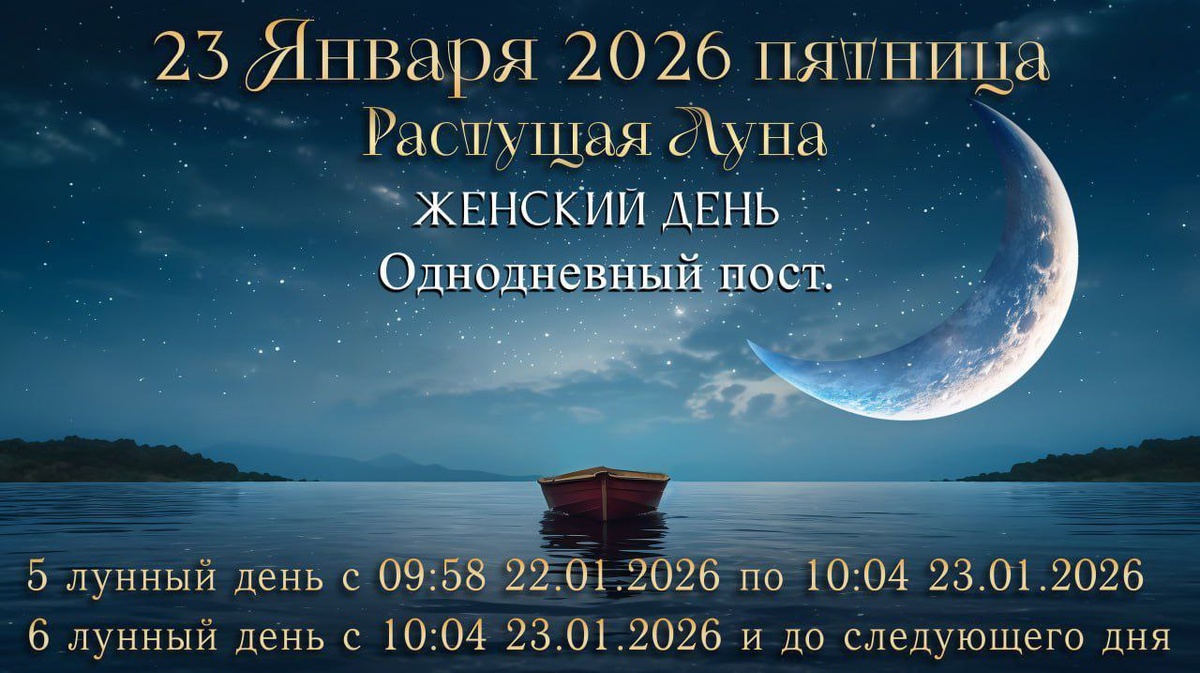 5 лунный день c 09:58 22.01.2026 по 10:04 23.01.2026 6 лунный день c 10:04 23.01.2026 и до следующего дня Однодневный пост. 6 лунные сутки — гармоничный и продуктивный день, подходящий для активной деятельности и уверенных шагов вперёд. Энергия суток благоприятствует новым начинаниям, запуску проектов и решению сложных рабочих вопросов. Это удачное время для разговоров с начальством и обсуждения профессиональных перспектив, однако действовать лучше мягко и без давления.Домашние дела пойдут легко, особенно мелкие и текущие задачи. Финансовая сфера в целом благоприятна — допустимы операции и расчёты при разумном подходе, без излишнего риска. День располагает к общению, налаживанию контактов и личным встречам, усиливает симпатию и взаимопонимание. Поездки возможны в спокойном формате, без перегрузки и спешки. Луна в Рыбах добавляет чувствительность, интуицию и творческое настроение. Она поддерживает занятия, связанные с красотой, искусством и эмоциональным общением. Хорошо проводить вр