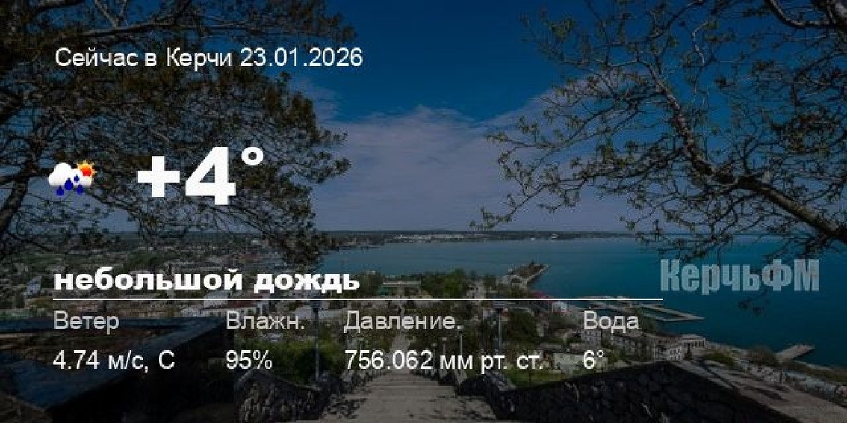 Сегодня днем в Керчи, 23 января, ожидается небольшой дождь, температура воздуха от +2° до +4.3°С, ветер северный 4.05 м/с, порывы до 7.43 м/с, давление 756.1 мм рт. ст., влажность 96%. Ближайшей ночью ожидается пасмурная погода, температура +5.4°С. Завтра, 24 января, в течение суток ожидается дождь; ночью +5.4°С, днем +4.1°С, ветер северный 3.59 м/с. - Феодосия от +3.4° до +5.6°С, ☁️ пасмурно, море: 4°C - Судак от +2.4° до +4.9°С, ☁️ пасмурно, море: 4°C - Симферополь от +0... подробнее Подписывайся на КерчьФМ.РФ @kerchfm