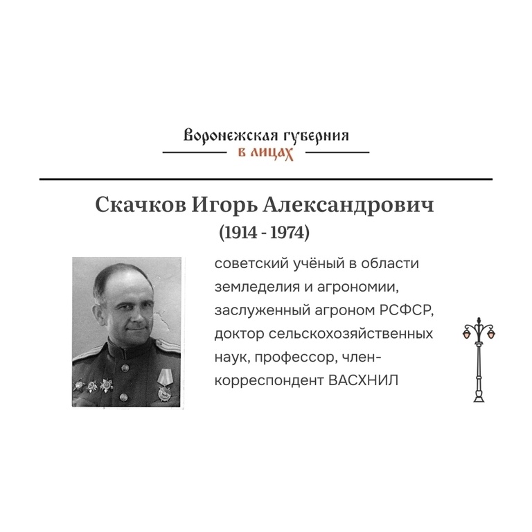 » В 2025 году в процессе реализации проекта «Воронежская губерния в лицах. Истории, которые вдохновляют» было достигнуто соглашение между АНО «Новая Экосистема» и Воронежским областным краеведческим музеем (https://vk.com/club135394155) о запуске отдельного музейного проекта «Локально о глобальном». Который бы рассказал о людях, которые прославили районы Воронежской области, в которых они росли, работали, жили и стали примером для современников и последователей. К нему присоединились районные музеи Воронежской области. Сегодня мы расскажем про человека, информацию о котором предоставил МКУ «Таловский районный историко-краеведческий музей» при поддержке Воронежского областного краеведческого музея. Итак, знакомьтесь... 🥔 Игорь Александрович Скачков: агроном Черноземья Игорь Александрович Скачков (1914–1974) — выдающийся советский ученый-агроном, доктор с.-х. наук, профессор, член-корреспондент ВАСХНИЛ, заслуженный агроном РСФСР. Ветеран Великой Отечественной войны, награжденный орд