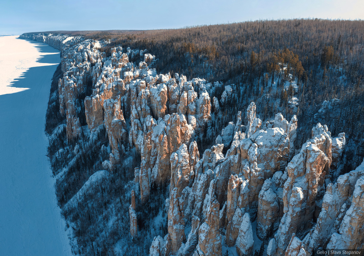 Целый комплекс вертикальных отвесных скал тянется вдоль берега Лены в Якутии. Высота Ленских столбов достигает 220 метров над уровнем реки — сопоставимо с небоскрёбами Москвы-Сити. При этом протяжённость стены — около 40 км. Скалы образовались примерно 400 тысяч лет назад — в те времена постепенно поднималась территория Сибирской платформы, возникали разломы и глубокие речные долины. Скалы вышли на поверхность почти ровной отвесной стеной, а тысячи лет эрозионного выветривания придали им причудливую столбчатую форму. Сейчас Ленские столбы — объект всемирного наследия ЮНЕСКО и национальный парк России, здесь работают учёные, а увидеть это чудо природы ежегодно приезжают десятки тысяч туристов. 1. Скалы выглядят как огромная стена, уходящая в воду. По сути эти столбы — останцы разрушения коренных пород. 2. 500 млн лет назад здесь находилось мелководное море, в котором обитали трилобиты — существа до метра в длину с очень прочным панцирем. На территории парка до сих пор находят их останки