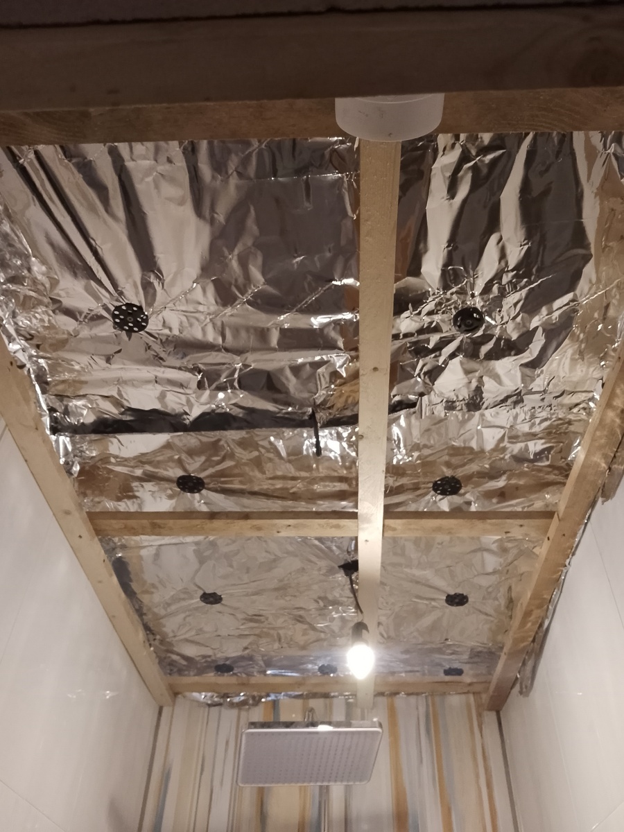 Здравствуйте наше вам! Зима у нас начинает постепенно отступать, хорошо бы если бы это не повторилось. Итак как то все застопорилось, скомкалось, все планы насмарку. С одной стороны вроде здорово, могу со спокойной совестью заниматься обустройством бани, с другой, копится недоделанная работа, а она стоит мечом дамокловым, и чувствую себя очень неудобно. Столько всего уже нужно сделать, кто то уже очень давно ждет, а время летит. Но вернемся к бане, пожалился и будет. Как уже говорил, вагонка закуплена, можно приступать к монтажу. Один день насмарку, электрики что то там ремонтировали, фазы не было, так что нужно наверстывать. Начал с душа. Обрешетка прикручена через кафель к стене, высота потолков в душевой под два шестьсот не нужна, так что утеплил еще тонким пеноплексом, от парилки осталась фольга, прикрепил и в душевую. Лишней не будет, пароизоляция лишней не бывает, да и так бы со временем фольгу выкинул, а так, пригодилась. Два светодиодных, встраиваемых светильника, дают