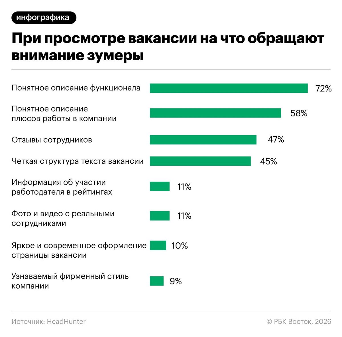 В интервью РБК Восток директор дальневосточного филиала HeadHunter Ксения Аверина рассказала, что для зумеров важна прозрачность уже на этапе просмотра вакансии. Как привлечь молодые кадры в компанию – в инфографике РБК. 🔗 РБК Восток в Telegram и MAX