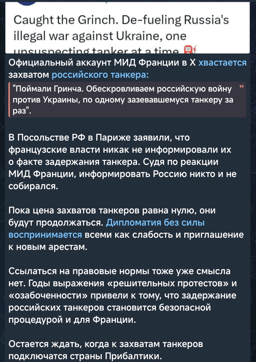 Сейчас идет разгон информации в телеграм каналах. Франция и Британия захватили "российский" танкер. Танкер с именем Гринч, был захвачен в Средиземном море спецслужбами Франции. Его приписывают к теневому флоту России.