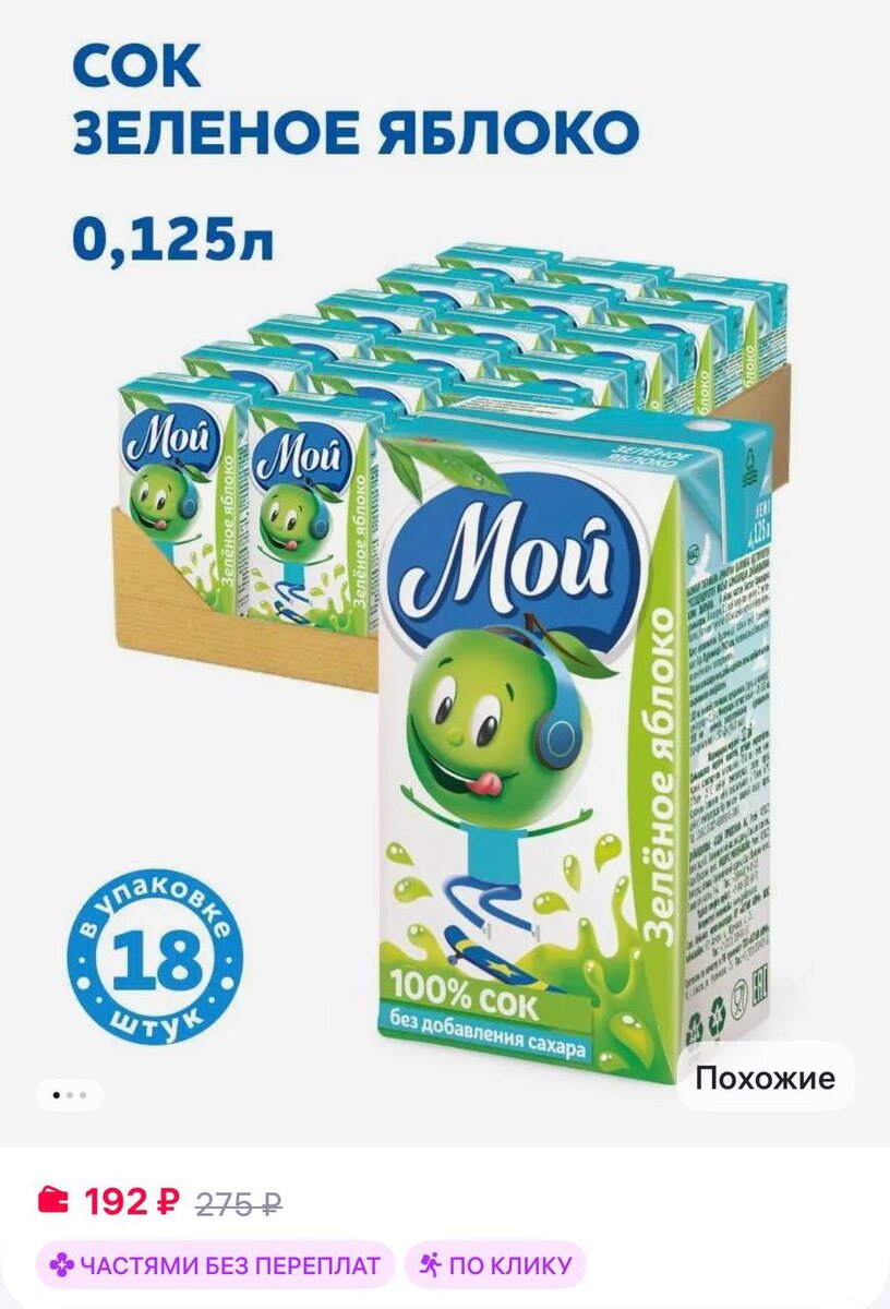 😀😀😀мой Сок яблочный из зеленых яблок осветленный 0,125л "Мой" 18 шт
