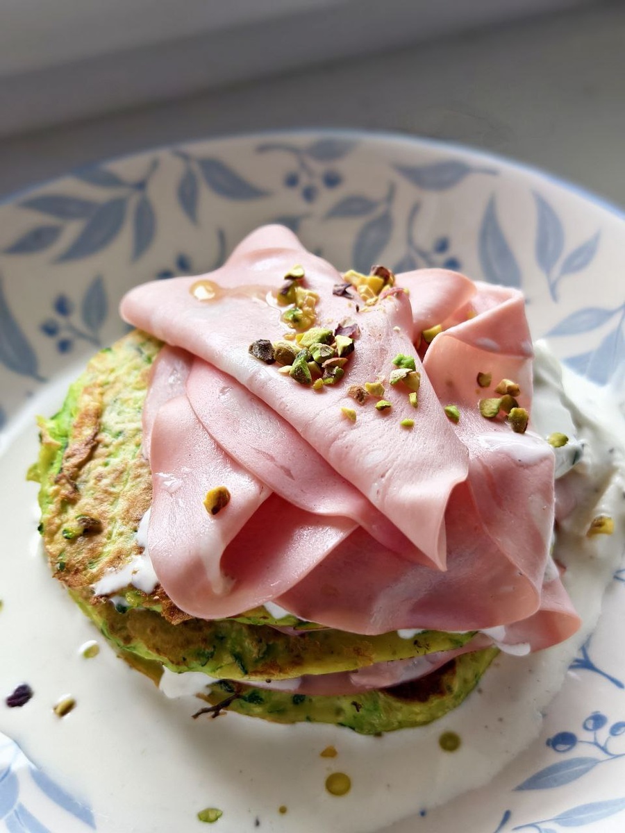 Когда люди говорят "не люблю овощи", я смотрю на них с осуждением. Почему-то эти человеки думают, что овощи - максимум скучная брокколи на пару без соли и масла. Но вообще-то, овощи могут выглядеть и так. 🟢цукини или кабачок - 1шт., 350-400гр 🟢куриное яйцо - 1 шт. 🟢мука - 70гр 🟢зубчик чеснока - 1 шт. 🟢соль - 0,5 ч.л. 🟢свежемолотый перец 🟢страчателла и мортаделла - сколько хотите. 🟢трюфельное масло - по желанию и наличию. Готовить просто до банального. Натрите цукини на крупной тёрке и отожмите из него влагу любым способом - руками, через марлю или через сито. Разбейте яйцо в миску и размешайте его, соедините с отжатым цукини, добавьте просеянную через сито муку и соль. Снова размешайте до однородной массы. Хорошо разогрейте сковороду и выкладывайте будущие оладьи. Остаётся только их поджарить до золотистой корочки с двух сторон. Главное - не выкладывайте массу слишком толстым слоем. Как оладьи будут готовы - выкладывайте их стопочкой, сверху - страчателла с мортаделлой. Пр