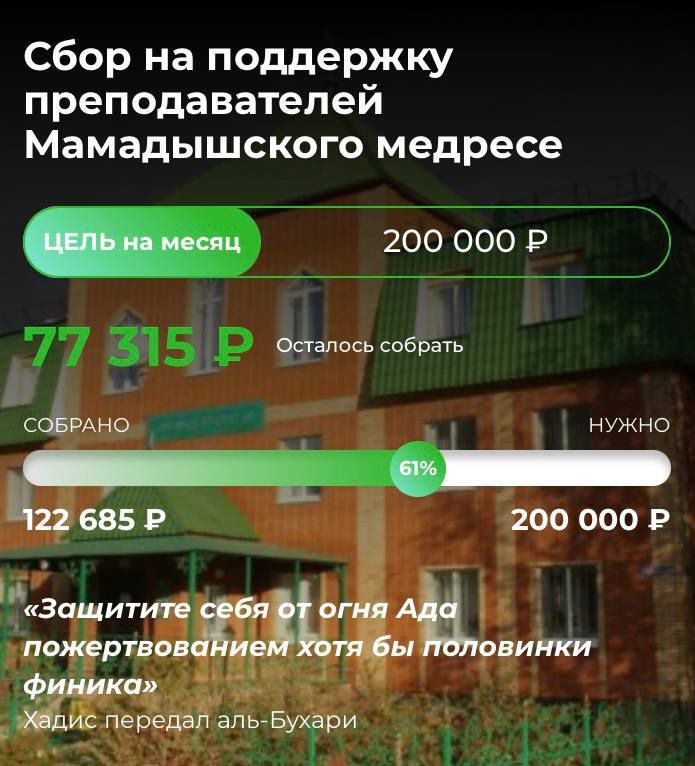 🌿Альхамдулиллях! Открыт ежемесячный сбор на поддержку устазов Мамадышского медресе. По милости Всевышнего в январе уже собрано 122 685 ₽. 📚В Мамадышском медресе Коран и исламские науки передаются от сердца к сердцу. Устазы здесь — опора и ориентир, формирующие будущих имамов, хафизов и учителей. По милости Аллаха и благодаря вашей поддержке удалось повысить базовую заработную плату устазов с 15 000 ₽ до 30 000 ₽. Чтобы сохранить этот достойный уровень, необходимо ежемесячно собирать 200 000 ₽. 🎯Цель месяца — 200 000 ₽. 🔗Поддержать: mamadysh-medrese.ru 📢 ТГ-канал медресе: t.me/Medrece 🌱То, что отдано ради Аллаха, остаётся и приносит плоды.