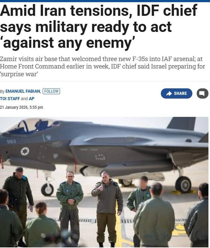Издание пишет, что в течение примерно 24 часов будет завершено развертывание сил США в регионе Ближнего Востока, с этого момента атака на Иран будет возможна в любой момент. На фоне этого начальник Генштаба Армии обороны Израиля Эяль Замир заявил в среду, что армия готова действовать против любого врага, представляющего угрозу для страны. 🤗 НАСОНОВ 🔴