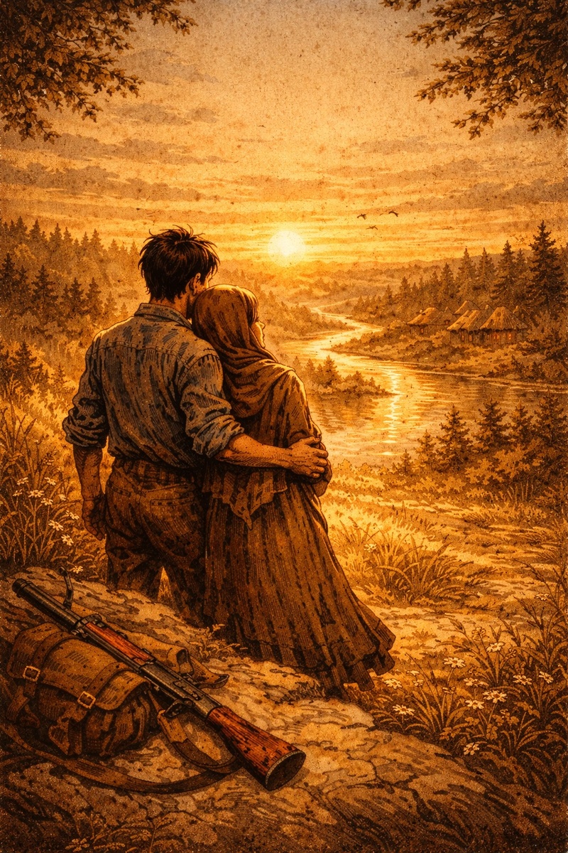 Утро пришло мягко, без криков и выстрелов. Солнце медленно поднималось над горизонтом, золотя лесные поля и крону деревьев. Каждый луч казался победой, каждым лучом отмечая их выживание. Антошка проснулся первым. Он посмотрел на Ольгу, спящую рядом. Её лицо было спокойным, словно она наконец могла отпустить весь страх, всю боль, всю усталость. Он нежно коснулся её руки — она шевельнулась и улыбнулась во сне. — Доброе утро, — сказал он тихо, хотя она ещё не проснулась. — Доброе утро, свобода. Ольга открыла глаза и тут же села, взгляд её встретился с его. — Мы сделали это, — сказала она шёпотом. — Мы живы. — Да, — ответил он, улыбаясь впервые без напряжения. — И теперь у нас есть жизнь, чтобы прожить её вместе. Они вышли на поляну перед хижиной. Земля под ногами была мягкой, покрытой росой. В воздухе пахло свежестью, смешанной с дымком из печки, где крестьяне разожгли утренний огонь. Звуки леса были теплыми и спокойными: пение птиц, шелест листвы, легкий ветерок. Антошка и Оль