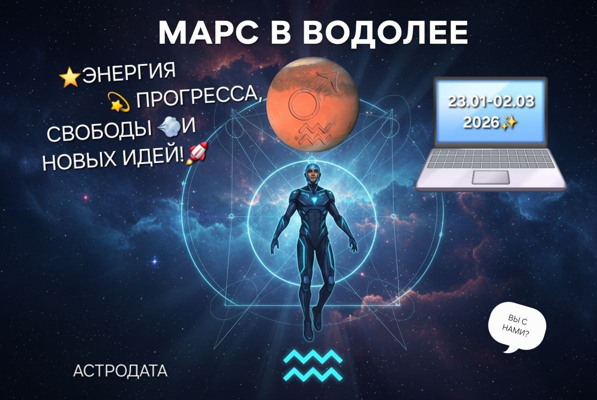 ! 🤗 🚀 Наш астрологический календарь сообщает: 🗓️ 📢 23 января 2026 года активная планета действия Марс перешел в знак Водолея. Его энергия освобождается от жестких рамок и направляется на обновление жизни, поиск свободы и коллективное творчество. Наступает период, благоприятный для внедрения реформ, использования новых технологий и объединения с единомышленниками. 📚 НАША МЕЖДУНАРОДНАЯ ШКОЛА АСТРОПСИХОЛОГИИ АСТРОДАТА👩🏫🚀🏺 приглашает использовать этот импульс обновления для вашего роста! ⚡️ Врываемся в активные выходные-> уже сегодня 23 ЯНВАРЯ на встречу в ЗИМНЕМ АСТРОКЛУБЕ: https://astrodata.pro/zimastroclub Продолжаем расширять горизонты: 🔭 24 ЯНВАРЯ разбираем на МИНИ–КУРСАХ как ЮПИТЕР и САТУРН перекроят реальность в 2026 году: https://astrodata.pro/trsj Читайте далее в комментариях 👇 #астрология #обновление #водолей #энергия #будущее #astrodata