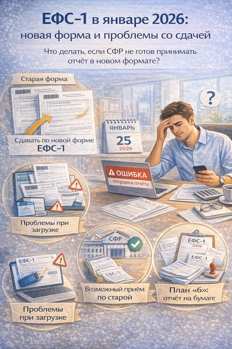 С 30 декабря 2025 года Социальный фонд России (СФР) официально утвердил обновлённую форму отчёта ЕФС-1 и новый порядок её заполнения (приказ СФР от 17.11.2025 № 1462), а также электронные форматы (приказ СФР от 17.11.2025 № 1463). Новая форма сохраняет структуру из титульного листа и двух разделов, но есть изменения в: Если вы сдаёте ЕФС-1 по итогам 2025 года (например, сведения о стаже и взносах за декабрь), то формально это уже новая форма, вступившая в силу 30 декабря 2025 г. Стандартные сроки сдачи при этом соответствуют общим правилам: То есть отчетную форму придётся готовить и отправлять по новой форме ЕФС-1. На практике встречается ситуация, когда: Это означает, что бухгалтерия может столкнуться с тем, что: 1) Готовить отчет по новой форме: